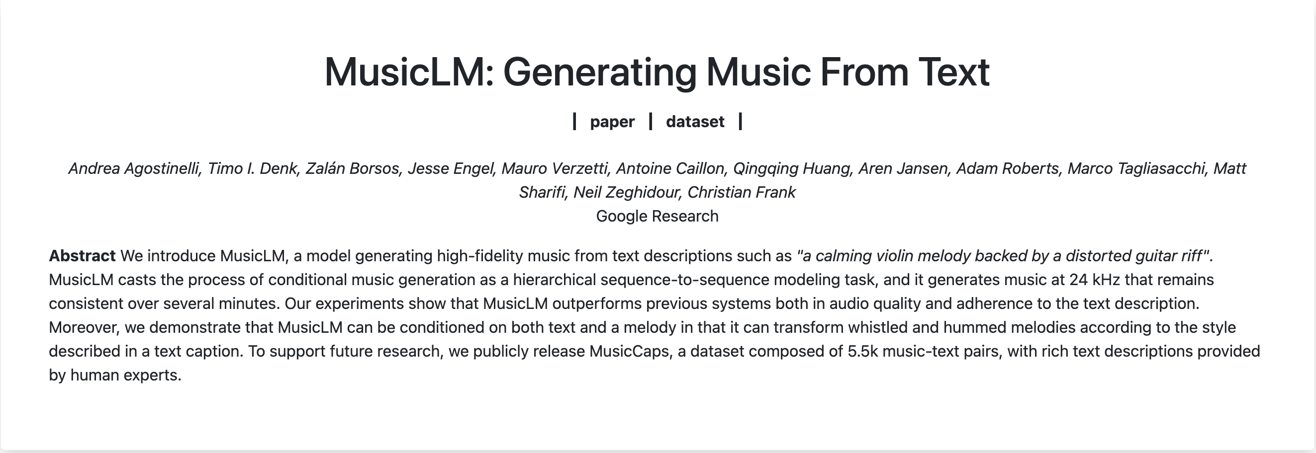 Google released a cutting edge research paper showcasing their new Text-to-Music generator. Seemingly, the algorithm can create any sound possible from an ample description. The study showcases prompts like “fast-paced and upbeat, with a catchy electric guitar rif” which generates accurate results.